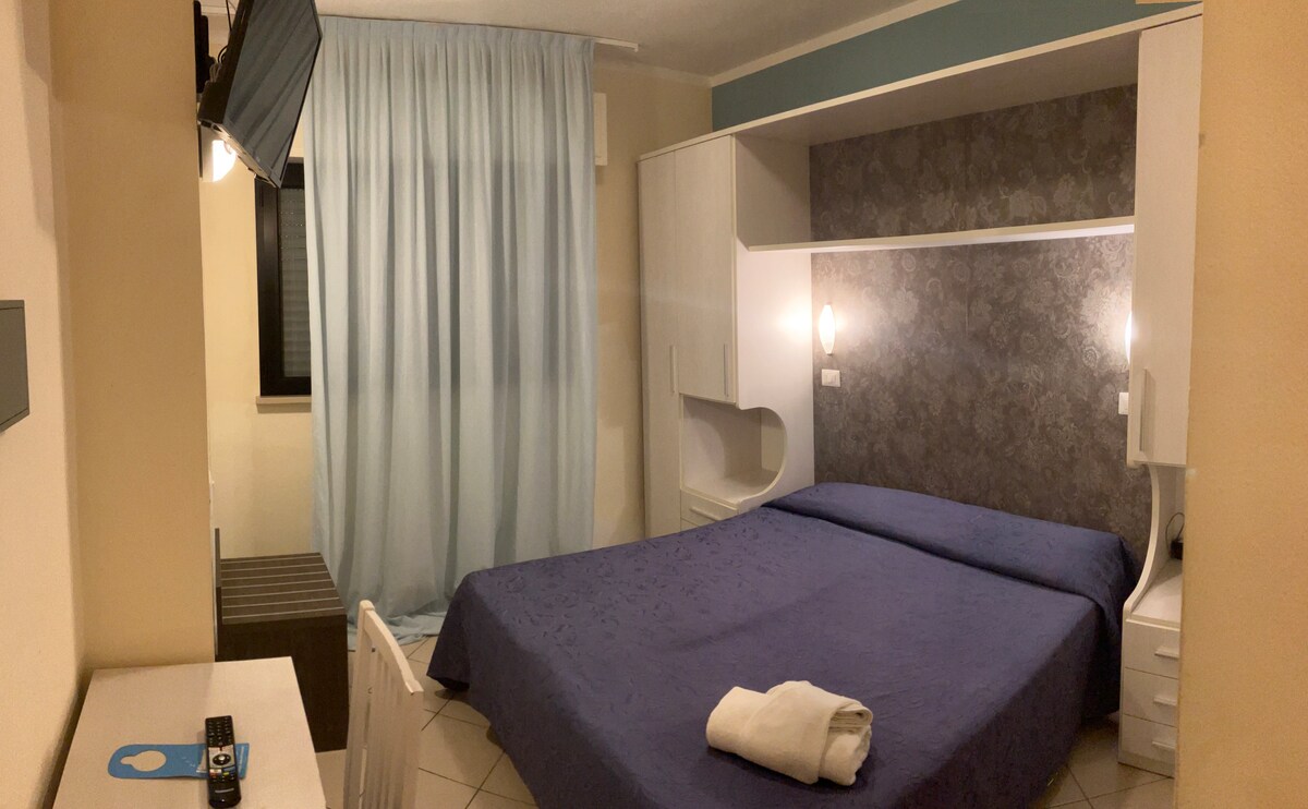 Quadruple room with balcony (double bed + bunk bed), private bathroom. Central air conditioning, safe, TV, hairdryer, and Wi-Fi. Comfortable double bed and bunk bed. Parking next to the hotel costs €8.00 per night. You can stay with your four-legged friend for an additional €10.00 per night. The tourist tax is €1.50 per night per person (children excluded).