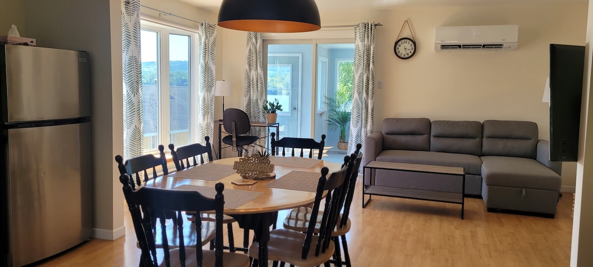 Appartement neuf. Espace feux extérieur ajouté 06-2022. BBQ ajouté 24-06-2022 .Vue sur la baie de 5 à 10 minutes à pieds de tout les services. Près des sites touristiques brasseries, café, restaurants et poissonnerie etc.. De 10 à 20 minutes en voitures pour les croisières de baleines. À 20 minutes de voitures de Tadoussac. À 10 minutes du site de plongé sous marine et parc Canada. À minutes à pied de la rivière à saumon. Un super petit café Kiboikoi à 2 minutes et une cantine à 1 minutes!