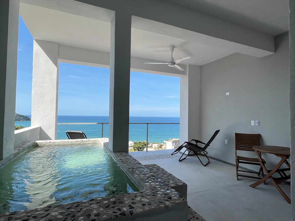 Brand new Studio apartment in Casa Infinito, Sayulita. Includes a private heated pool and infinite ocean views. Pillowtop king bed, high speed wifi and kitchenette. The mini private pool is heated. Enjoy wifi via Sayulitawifi to work from home, Smart TV, and a cozy pillowtop bed. This is the perfect romantic escape for a couple in a brand new ocean view complex just a minute drive to the beach. Common áreas include view gym and yoga deck with classes available daily