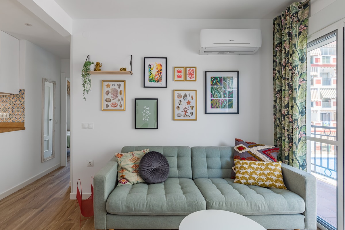 Azure Home is a unique and cozy space in Rincon de la Victoria, just 125m from the beach. A peaceful retreat offering a relaxing living room, 1 bedroom and 2 full bathrooms. Amenities include Wi-Fi, Smart TV, air conditioning, fans, washing machine, dishwasher, air-fryer, blender, juice extractor, kettle and a nespresso coffee machine. Just 15 km (20 min) from the center of Málaga, Azure Home is the perfect blend of comfort and tranquility to have a memorable experience and feel at home