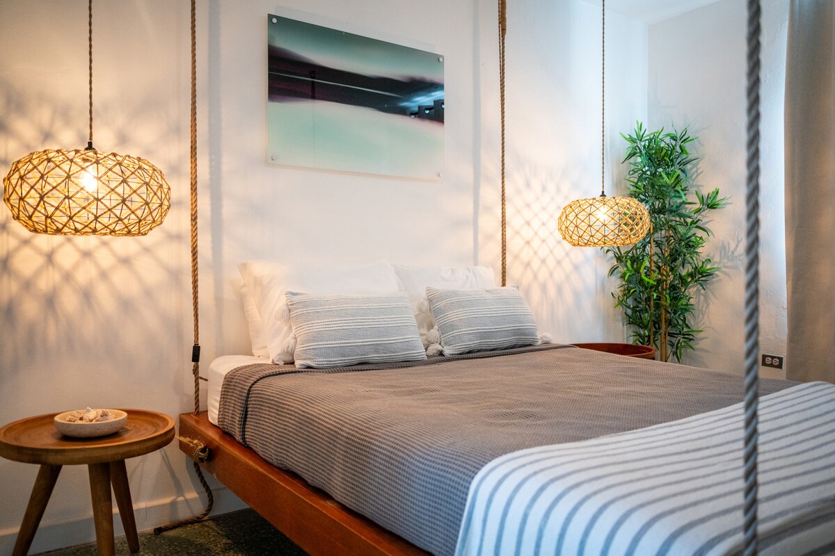 Relaxing villa ideal for couples, located in the heart of the Rincon surfing community. This immaculate studio features a comfortable king-size bed, coastal décor, and a bright, peaceful interior. Enjoy a spacious open-air living area with comfortable seating, relaxing hammock , and tropical views, plus a private balcony and access to a shared outdoor deck surrounded by lush gardens. Just minutes from world-class surfing, swimming, snorkeling beaches, and ocean and mountain sunsets.