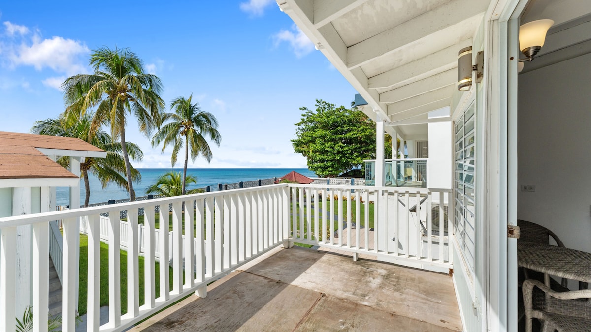Enjoy the upper unit of this beach villa in Sea Beach Colony on the best swimming beach in the heart of Rincon. Direct ocean views from every room. Great, quiet neighborhood, walk to everything in the heart of town. Decorated in a boho beach coastal living style, it's super comfortable. Enjoy tropical breezes and amazing views from large covered veranda, super beach vibes here! Just 2 houses up from the beach, many great restaurants and beach bars.
