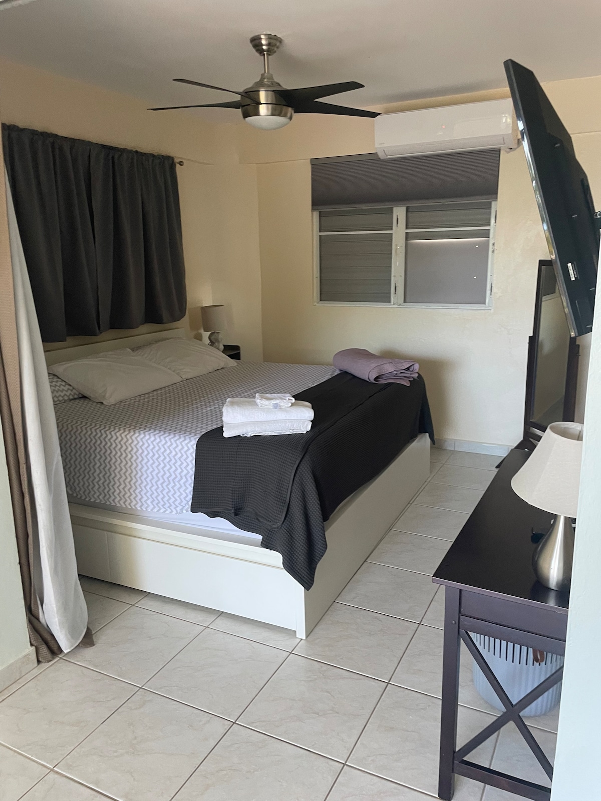 Recently refreshed studio near Sandy Beach with king bed, full bath, AC, WiFi, workspace, kitchen, dining area & private deck. Located on the lower level of a two-level home with private entry, single parking space & shared above-ground pool. Enjoy hilltop breezes, gorgeous ocean and valley view! Perfect for relaxing or exploring Rincon’s best beaches, restaurants & attractions—just off the famous Route 413, the road to happiness!