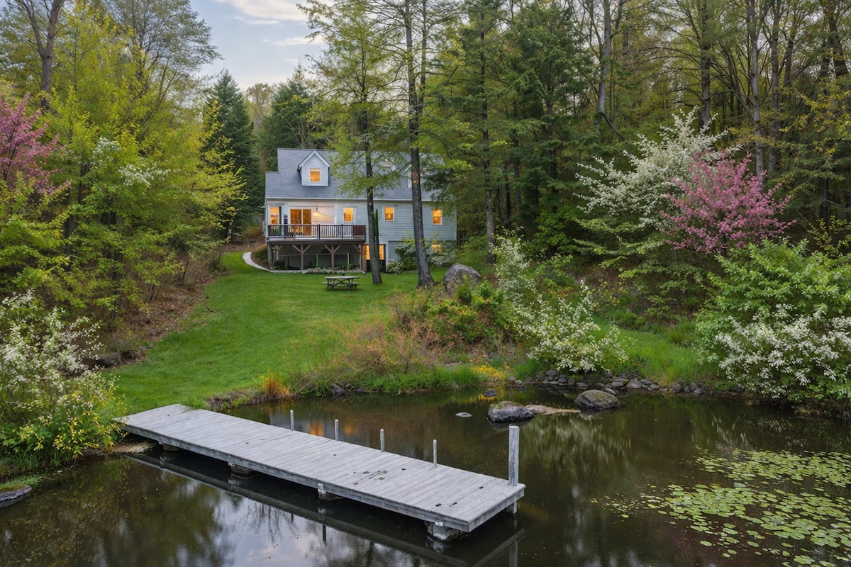 Escape to a modern post-and-beam farmhouse set right on the water, with rustic charm and upscale comfort. Cook in the fully equipped kitchen, then unwind in the outdoor hot tub under the stars. Sleep soundly in the king bed after exploring the pond with kayaks, using the private exercise room, or the lofted yoga space. Enjoy serene views and wildlife visits from deer, beavers, eagles and more. Great location close to hiking, skiing, waterfalls, and great local dining.