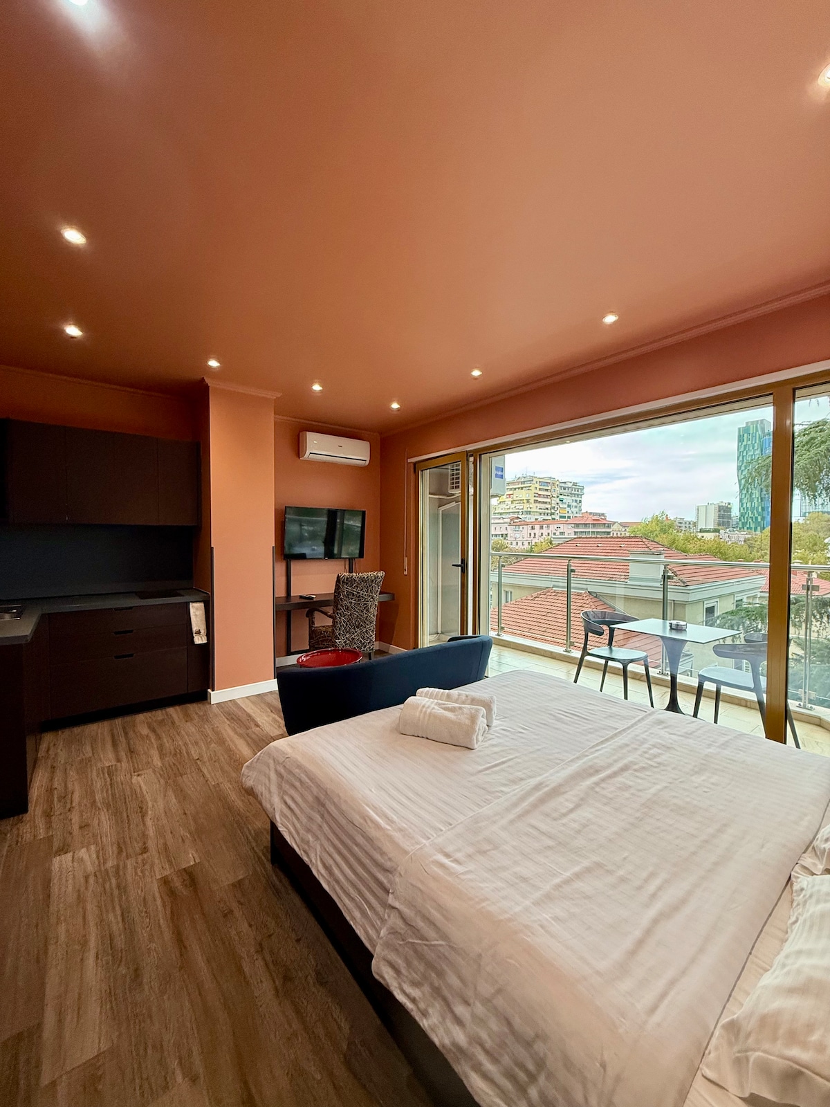 This cozy studio apartment in Myslym Shyri, Tirana, offers a prime location near Skënderbej Square and Blloku. The space features one multifunctional room with a comfortable bed, a small dining area, and a kitchenette equipped with essential appliances. The modern bathroom includes a shower and toilet. The apartment provides a perfect blend of comfort and convenience, ideal for exploring the city's cultural attractions and vibrant nightlife.