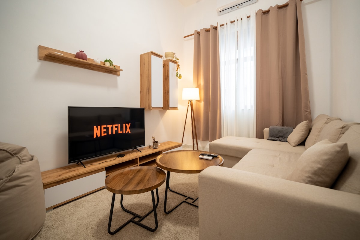 Our chic studio is a stylish retreat for everyone. Just a 2-minute walk to the city center, Bllok, and the main boulevard, the location is ideal. The modern interior offers a sense of simplicity and comfort with a well-equipped kitchen, cozy bed, modern bathroom, washer, and dryer. Whether you're exploring Tirana or enjoying a quiet night in, this studio is the perfect choice! One of two adjacent flats on the same floor – check 'Boutique Flat' for availability. Visit: airbnb.com/h/boutiquetr