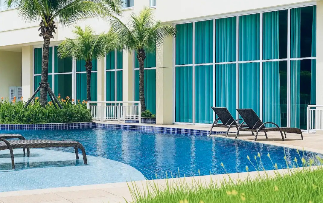 O apartamento fica no condomínio condomínio Maayan, dentro do bairro planejado Cidade Jardim, próximo a shoppings e praias. Possui segurança 24h, bares, restaurantes, padaria, farmácia, minimercado, salão de beleza, pista de corrida e lugares ao ar livre para passeios a pé ou de bike. Hospedagens com pelo menos 8 diárias terão direito de acessar as áreas privativas a partir da oitava diária, tais como piscina, academia, spa, quadra de Squash e brinquedoteca. Essas são as regras do condomínio.