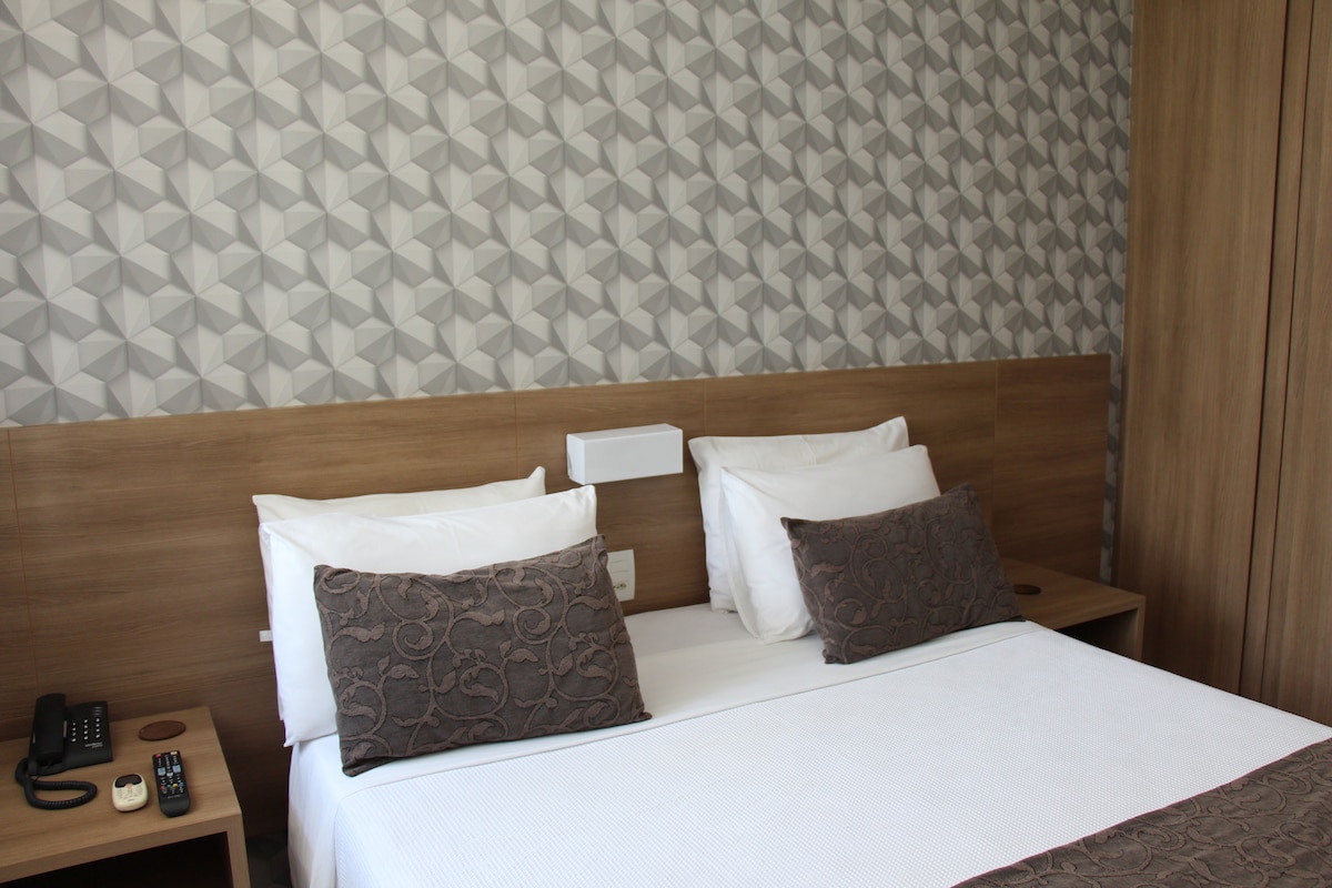 Loft independente. Cama de casal queen, banheiro privado, TV com 42 canais e chromecast, ar condicionado, microondas, cafeteira, frigobar, grill, armário, poltrona e escrivaninha. Ideal para quem busca local confortável e tranquilo no RJ, muito bem localizado, dentro do condomínio Rio 2, próximo ao Rio Centro e Parque Olímpico (5 min andando), shopping metropolitano e próximo à praia da barra (5 km). Possui recepção 24 horas, piscina, restaurante, academia, salão de beleza e mini market.