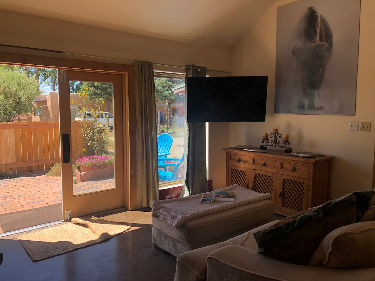 There is an incredible view of Taos Mountain from front of property. Architecturally, the Artists Retreat's interior is a balance of archways with contemporary linear angles, intimate yet spacious, sleeps three, designer decorated, fully equipped kitchen, Roku TV, 50” flat screen, wifi, washer dryer, & french doors lead to private patio to celebrate the evening with a glass of wine. Walking distance to historic plaza, museums, fine dining, Bent St. Shops & Kit Carson Park for music events.