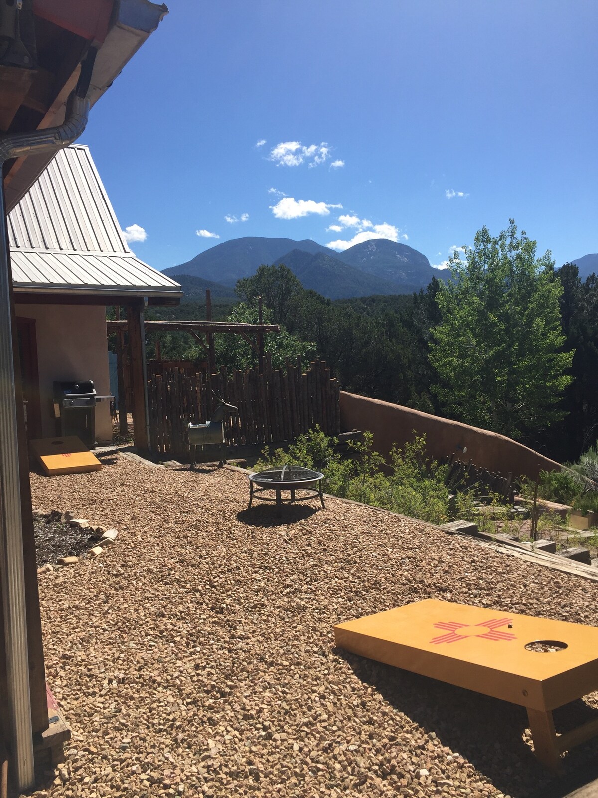 Our modern earth home is a cozy, craftsman-built nest that treats its visitors to light, open space & color. It has a quiet, private setting with everything needed to make your stay comfortable &, hopefully, inspired. The outdoors is this home's other half, creating an enveloping amphitheater of gardens, birds, trees & a hammock. Beyond this private nest are 360 degree views of the Sangre de Christo Mountains, the Rio Grande Gorge, spectacular sunset displays & miles of walking & bike trails.
