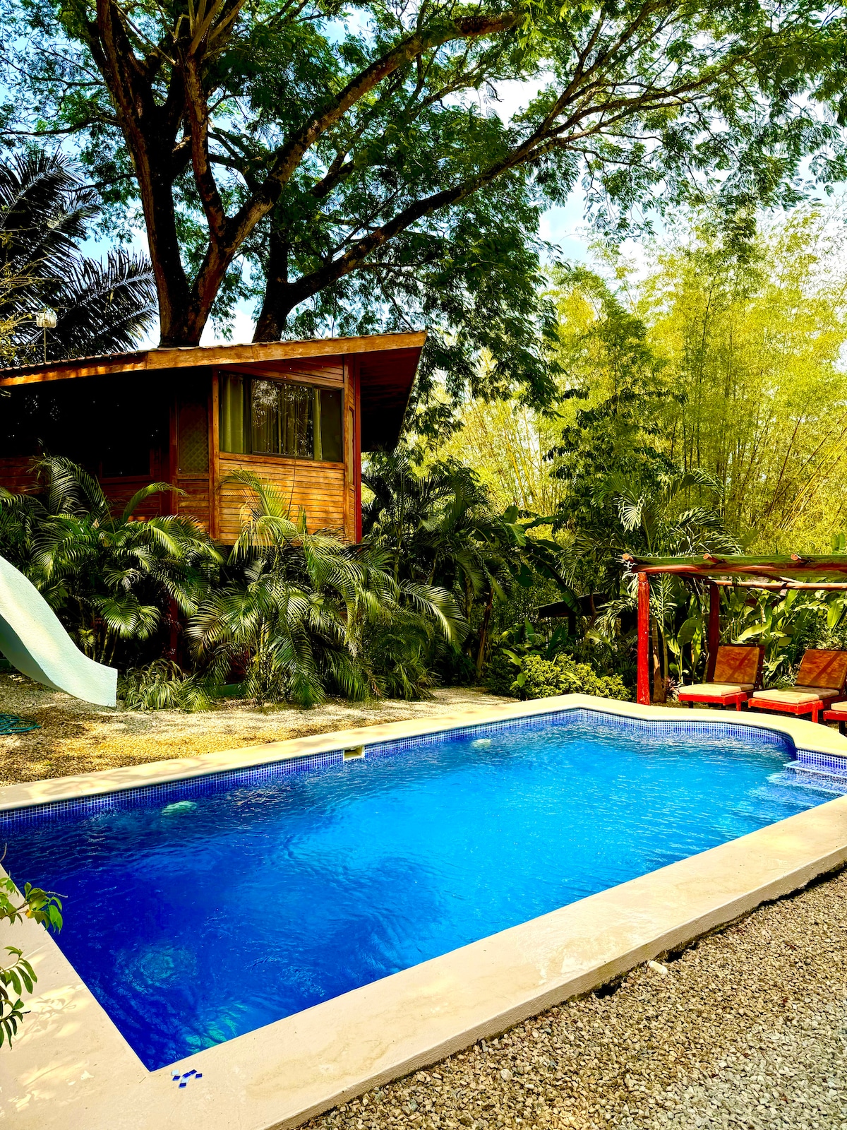 Escape to our enchanting wooden house in the Costa Rican jungle, a mere 5-min drive from breathtaking Puerto Carrillo Beach. Sleep under the stars in our third-floor 'treehouse' bedroom, a panoramic view of the tree canopy, comfortably enclosed in a mosquito net. Immerse yourself in nature, just 3 mins from local amenities. Perfect for Christmas, New Year (min 1-week stay), and Easter escapes (min 4 days). Experience the blissful blend of beach relaxation and jungle adventure!