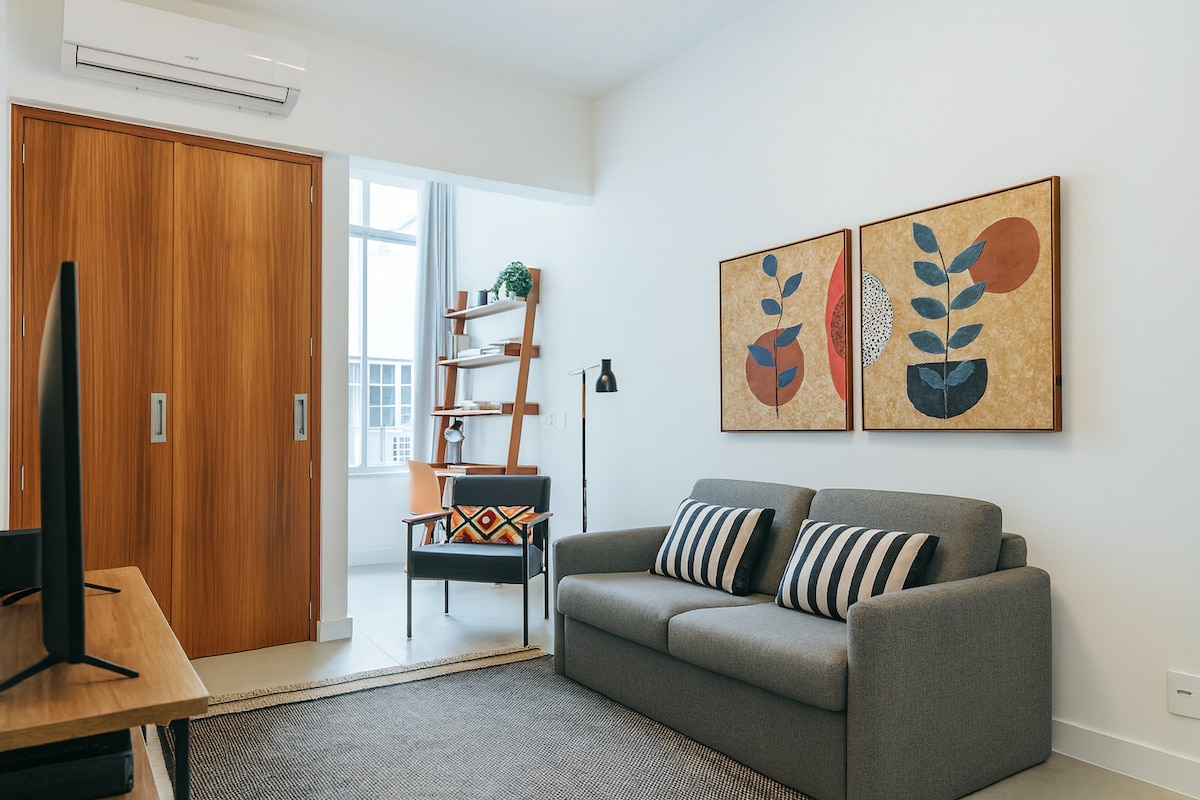 Charming and silent 25m2 studio, fully equipped, with high standard kitchen, bathroom and bedroom, and acoustic window with a 95% reduction of external noise. The studio is fully intelligent and responsive to voice commands (TV, sound, temperature and lighting). Located in the heart of Copacabana beach, our space is also just a few minutes walk from Ipanema beach, supermarkets, subway and a multitude of bars and restaurants, in the best of Rio style!