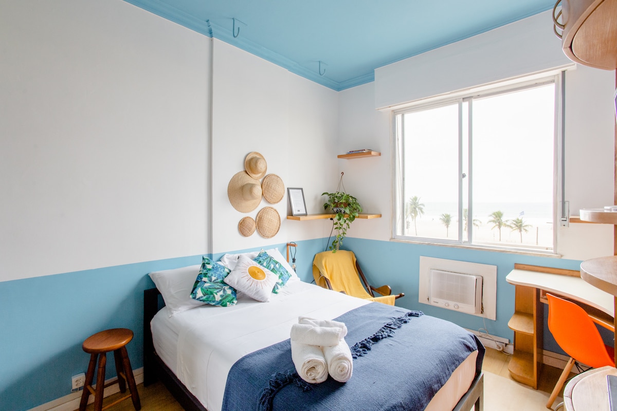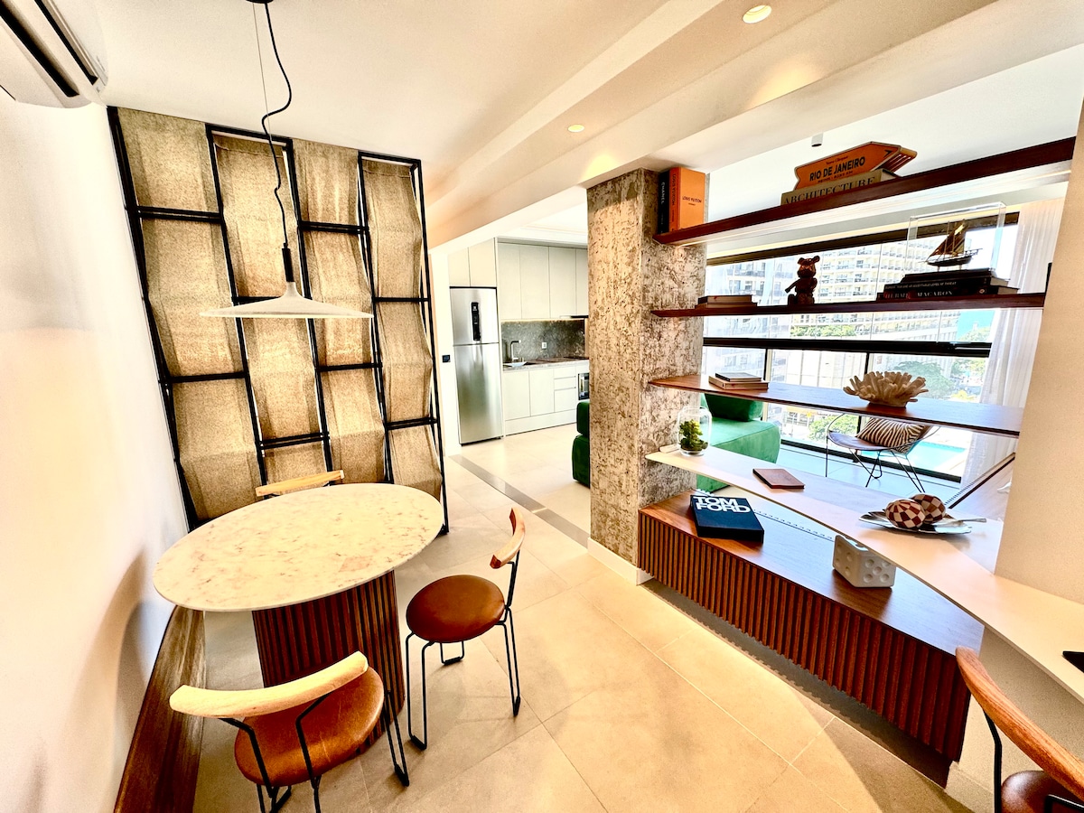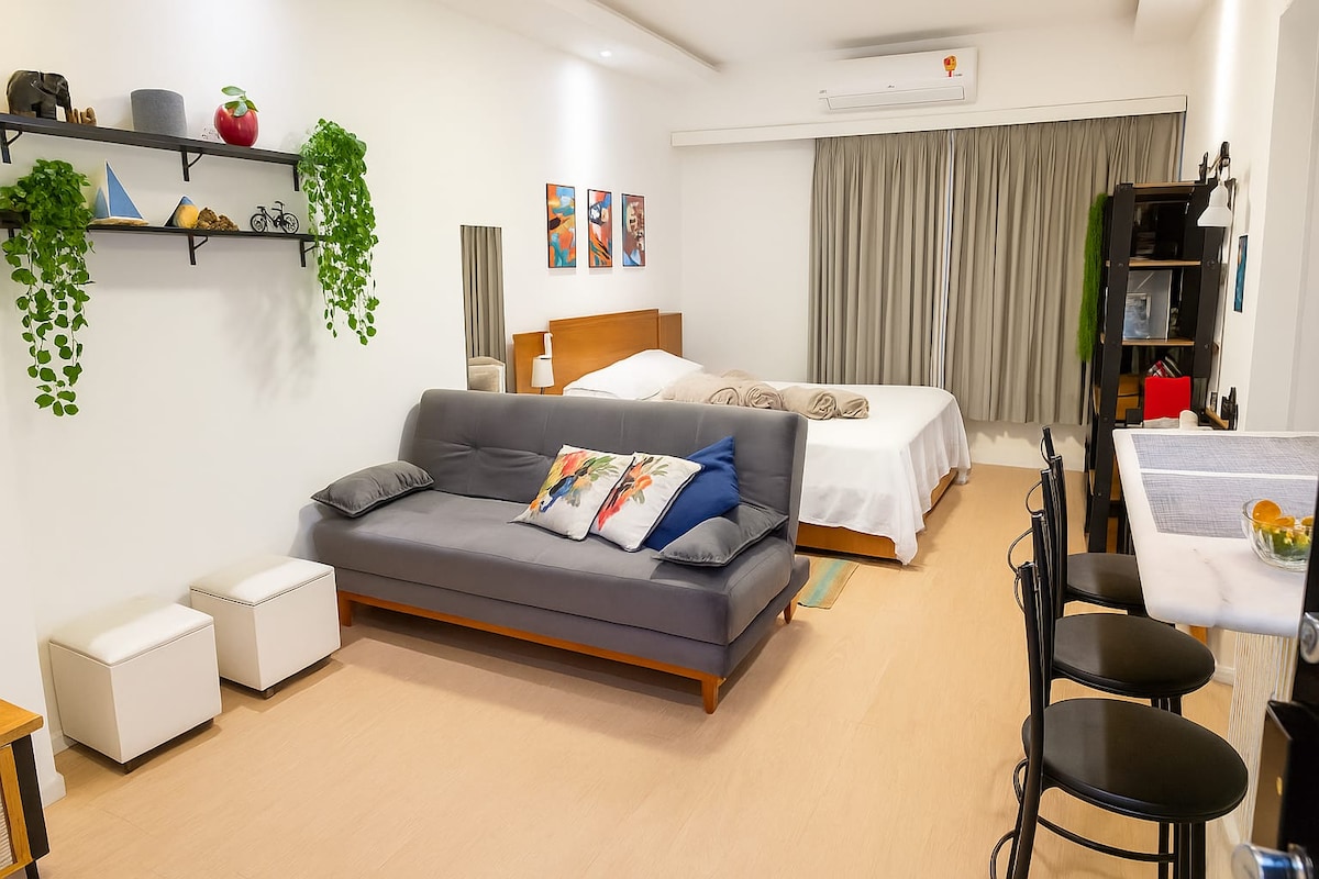 Boho chic style apartment, on the Copacabana beach! - Queen bed, sofa bed, dining table, air conditioning and space for home office (Wifi 300Mbps). Kitchen with stove, refrigerator, oven, microwave, blender, coffee maker, juicer, sandwich maker, pans, kitchen utensils, various books, guitar and TV with apps. - Market and pharmacy under the building, restaurants and shops around the apartment. - Airport at 8.3km - Cristo Redentor at 11.5km - Pão de Açúcar at 2.8km