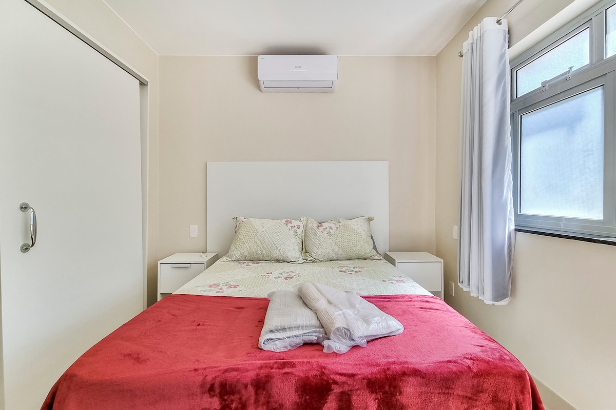 Amplo sala e quarto com varanda, decorado e totalmente equipado: Internet de alta velocidade, Wi-Fi, 2 smart tv's , sala com ventilador de teto e sofá cama, quarto com cama de casal e ar condicionado split, agradavel espaço/escritorio com impressora, cozinha americana com geladeira, fogão, micro ondas, torradeira, liquidificador, máquina de café Nespresso e utensílios domésticos, máquina de lavar roupas , charmosa varanda com vista lateral da praia e piscina.