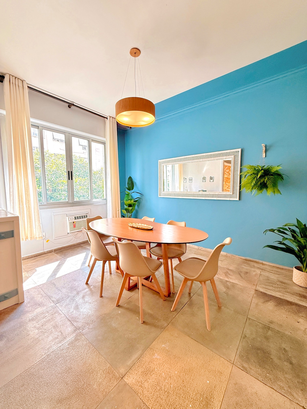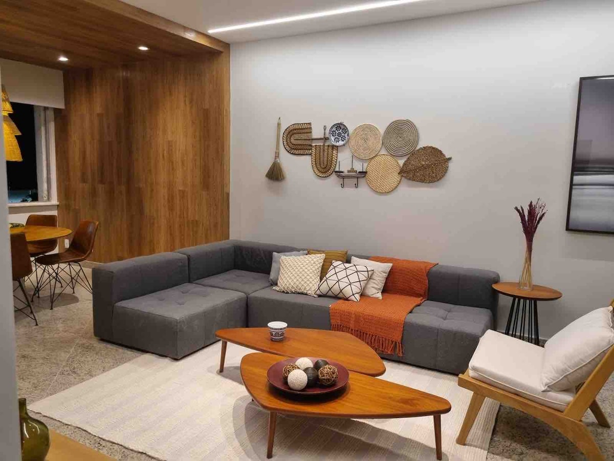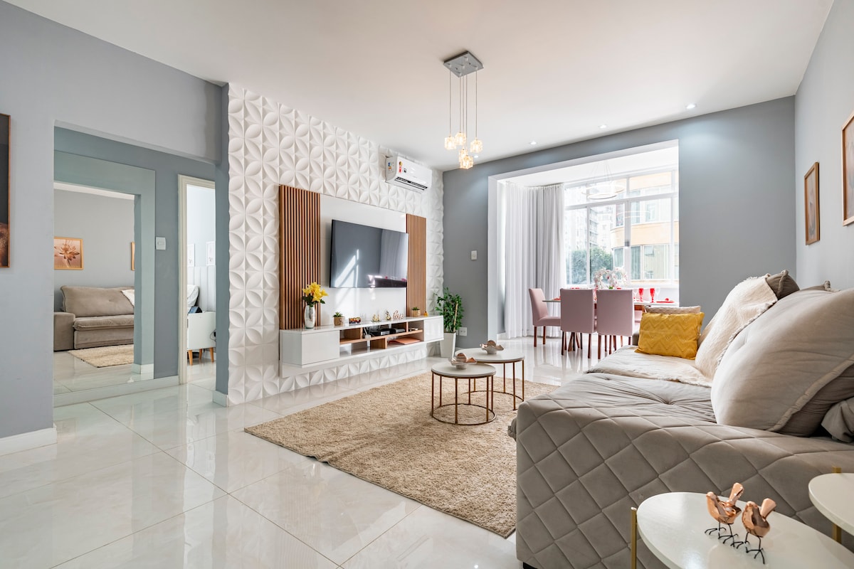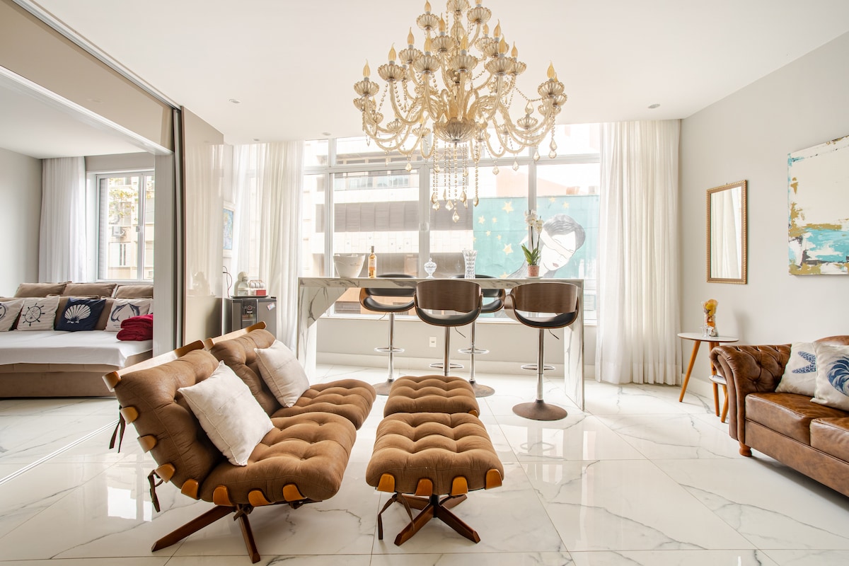Luxury apartment one block from the beach, 3 min walk, best spot in Copacabana, quiet street, 24h security, 4 bedrooms (1 suite with 50” smart TV/1 office), 2 Queen beds + 2 double beds, 2 bathrooms, 108m² fully renovated, all rooms with split air conditioning, full American kitchen, fridge, cooktop, oven, microwave, air fryer, 2 smart LCD TVs 65” and 50”, 5G wifi, washing machine. Located in the heart of Copacabana close to restaurants and shops. Self check-in and check-out anytime.