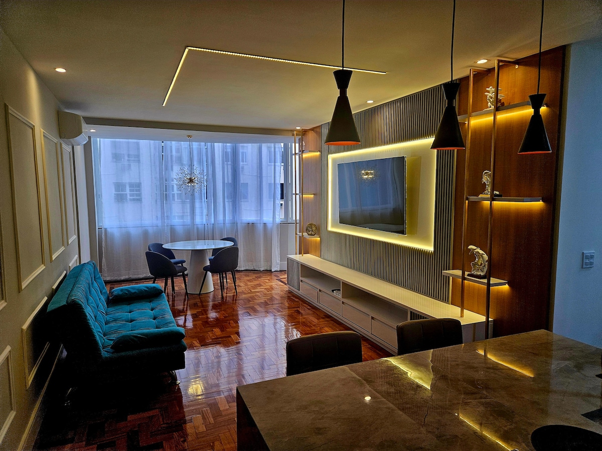 Luxury apartment one block from the beach, 3 min walk, best spot in Copacabana, quiet street, 24h security, 4 bedrooms (1 suite with 50” smart TV/1 office), 2 Queen beds + 2 double beds, 2 bathrooms, 108m² fully renovated, all rooms with split air conditioning, full American kitchen, fridge, cooktop, oven, microwave, air fryer, 2 smart LCD TVs 65” and 50”, 5G wifi, washing machine. Located in the heart of Copacabana close to restaurants and shops. Self check-in and check-out anytime.