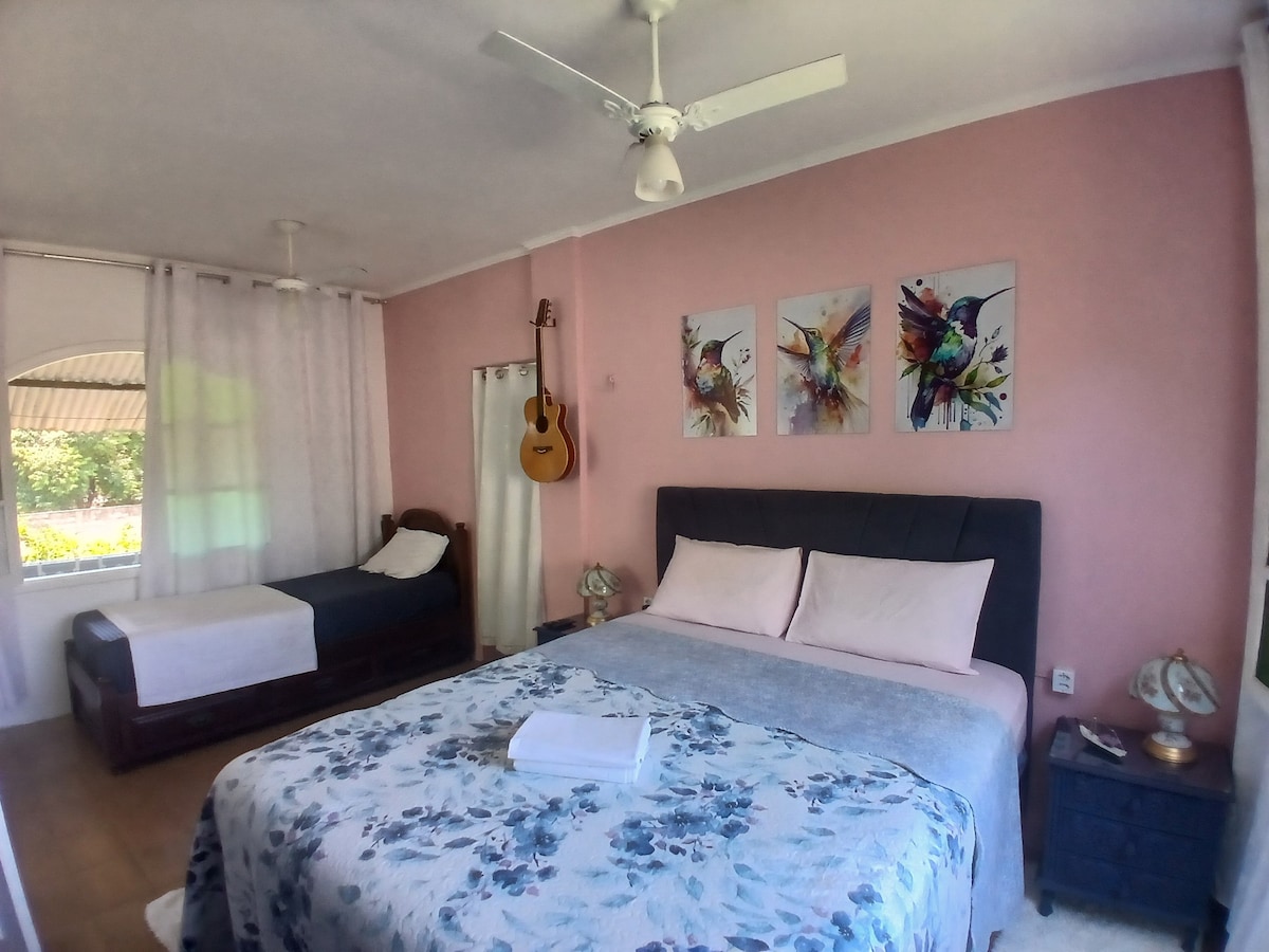 Stay at home in this luxurious and magical garden. We have a 13 meter pool, a patio with barbecue, terrace with day beds, fruit trees and an orchard with tomato and arugula to name a few. The guest house has a fully equipped kitchen, washing machine, 120mg wifi and ac. Two bikes are included and also jungle sounds!