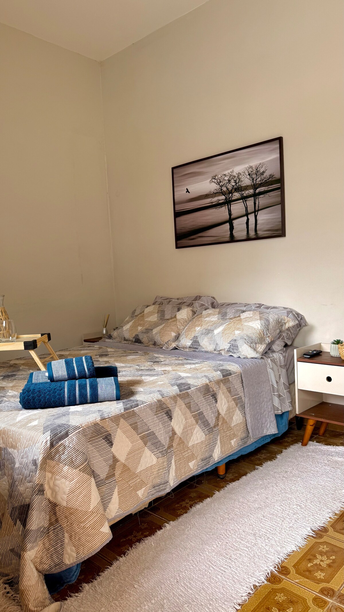 Se trata de uma suíte, independente, como de hotel , com cama de casal, ar-condicionado, armário, TV e com roupa de cama e banho. Café da manhã não incluído. Mas temos restaurante no prédio. Caso tenha uma terceira pessoa, será disponibilizado um colchonete.