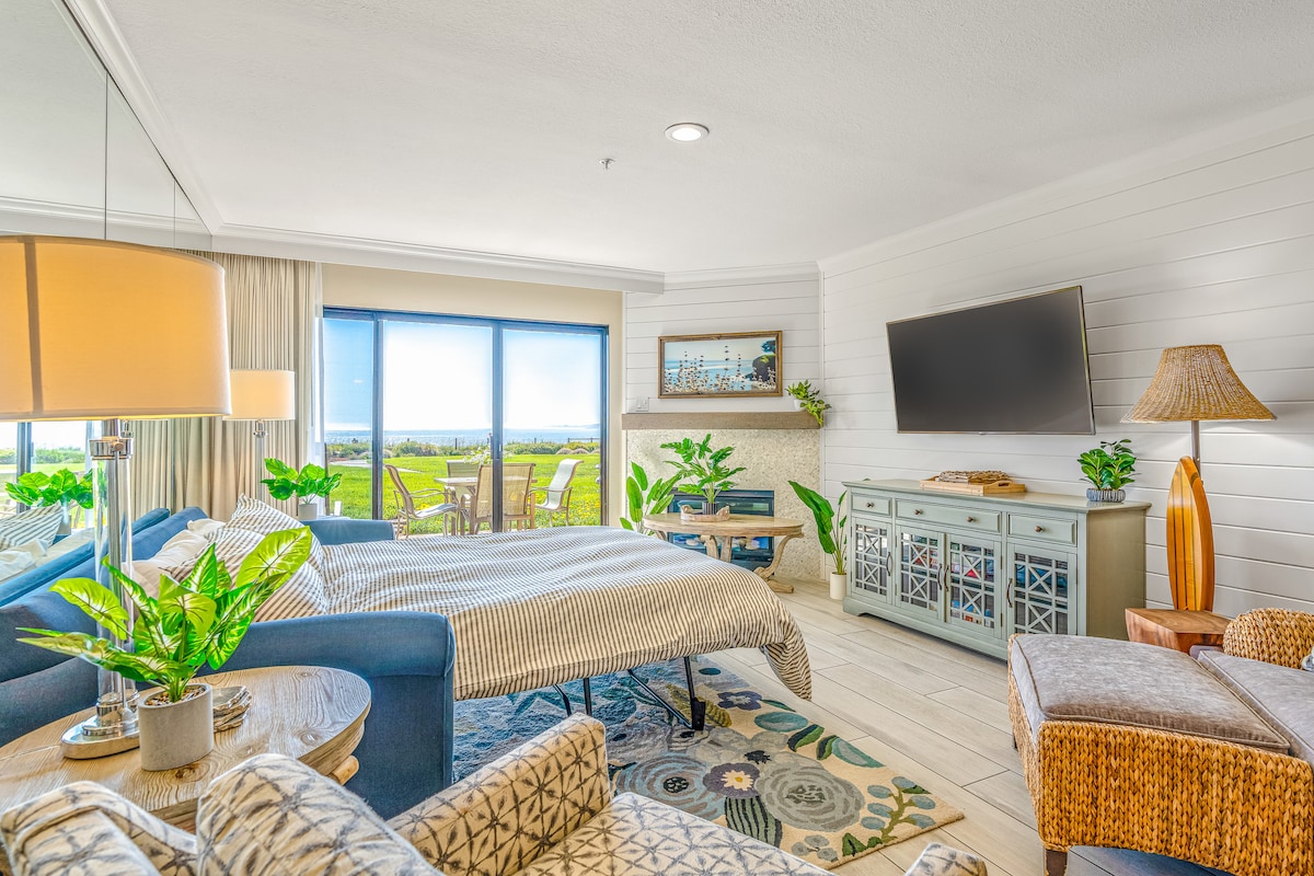 This listing offers an updated residential-style experience within a luxury resort—the best of both worlds! Featuring a primary bedroom with a king bed and en suite bathroom, a 2nd bedroom with a queen bed, and a separate guest bathroom. Enjoy the comfort of a living room with a gas fireplace, a fully equipped kitchen, and sofa seating. Each villa includes a private patio or balcony with an ocean view. Units are individually owned—decor and layout may vary.