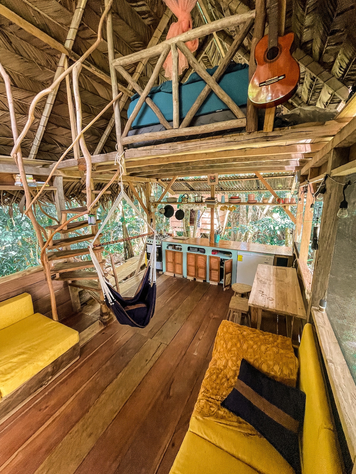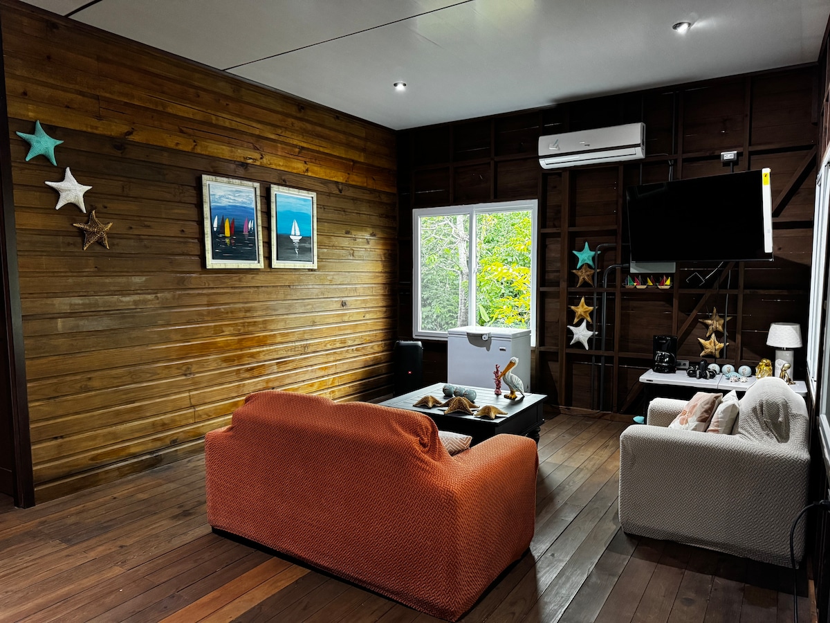 This is a small hotel named Hotelito perdido located on the outskirts of Livingston. We are only accessable by boat This two story bungalow will sleep up to 3 people. The living area has a private 2-person bedroom upstairs, and a sitting room below. The downstairs sofa can be converted into an extra single bed It is a perfect option for families, and or friends staying together. A shared bathroom is located in a separate building nearby Visit hotelitopperdido.com for more information