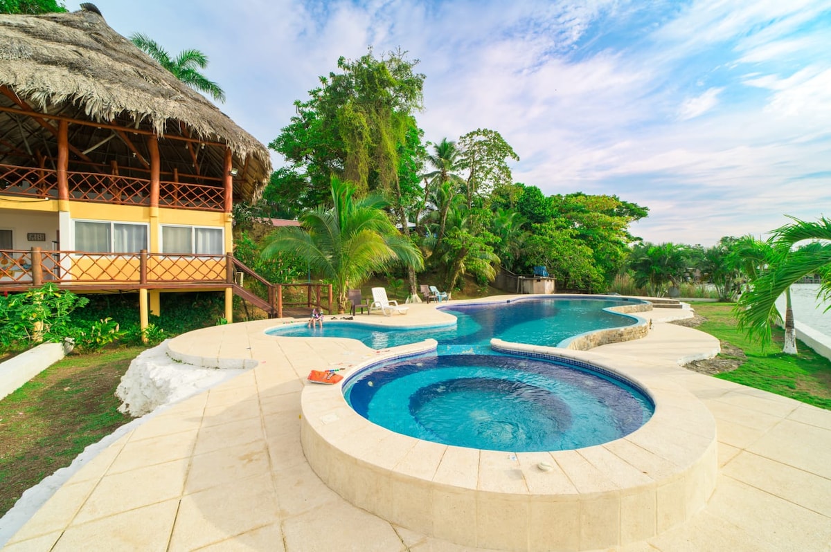 Happy Iguana Marina Cabin #2 is accessible by land or water and is a cozy waterfront retreat on the scenic Rio Dulce River. With two queen bedrooms and two sets of bunk beds in the living area, it comfortably accommodates families or groups. The cabin includes a bathroom with a stand-up shower, a kitchen with a fridge and cooktop, a dining area, and air conditioning. Guests have access to a pool, BBQ area, hammocks, and a shared dining space. Boat slips are available.