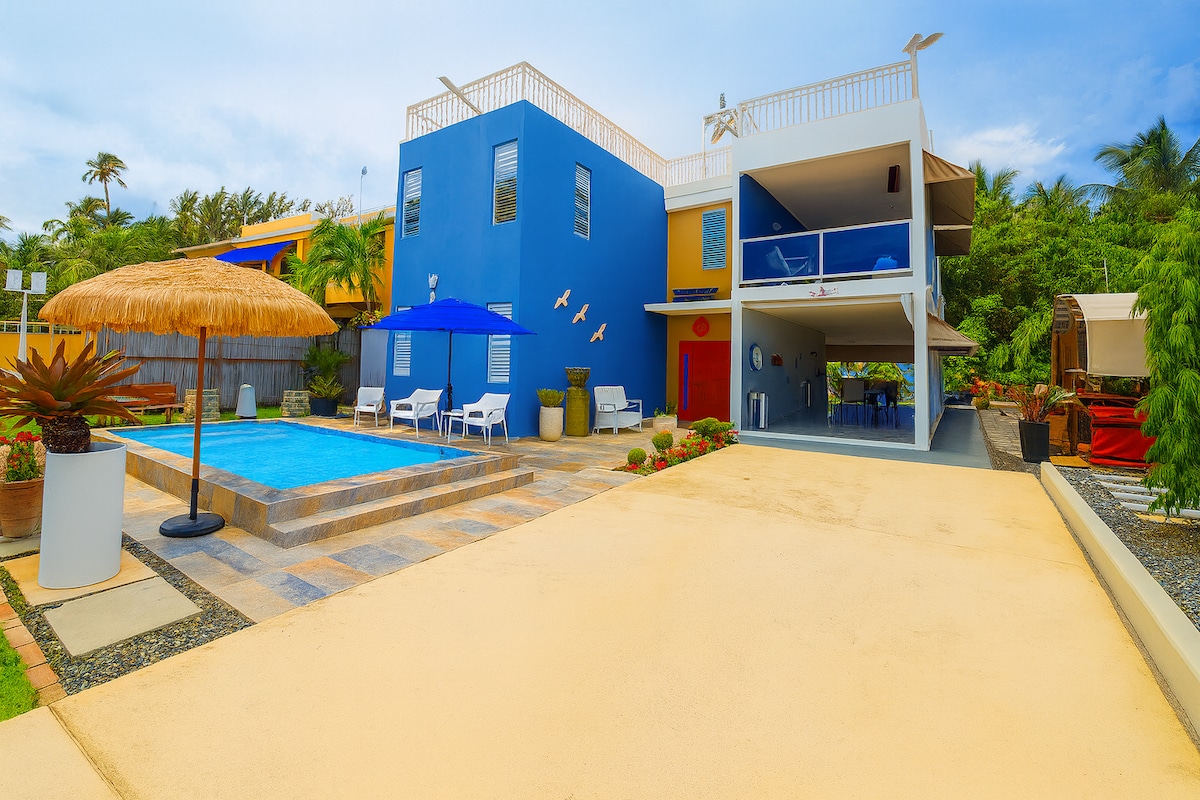 *Weather Guarantee - Inquire for details. Private 3 BR 3 Bath House on Quiet Beach with Resort-Like Amenities Located in the Most Desirable Area of PR. At the foot of the El Yunque Rain Forest and minutes from the best PR attractions. Tropical garden, A/C, private pool and hot tub, tiki bar with pizza oven, outdoor kitchen. Two levels with two kitchens great for two family sharing.