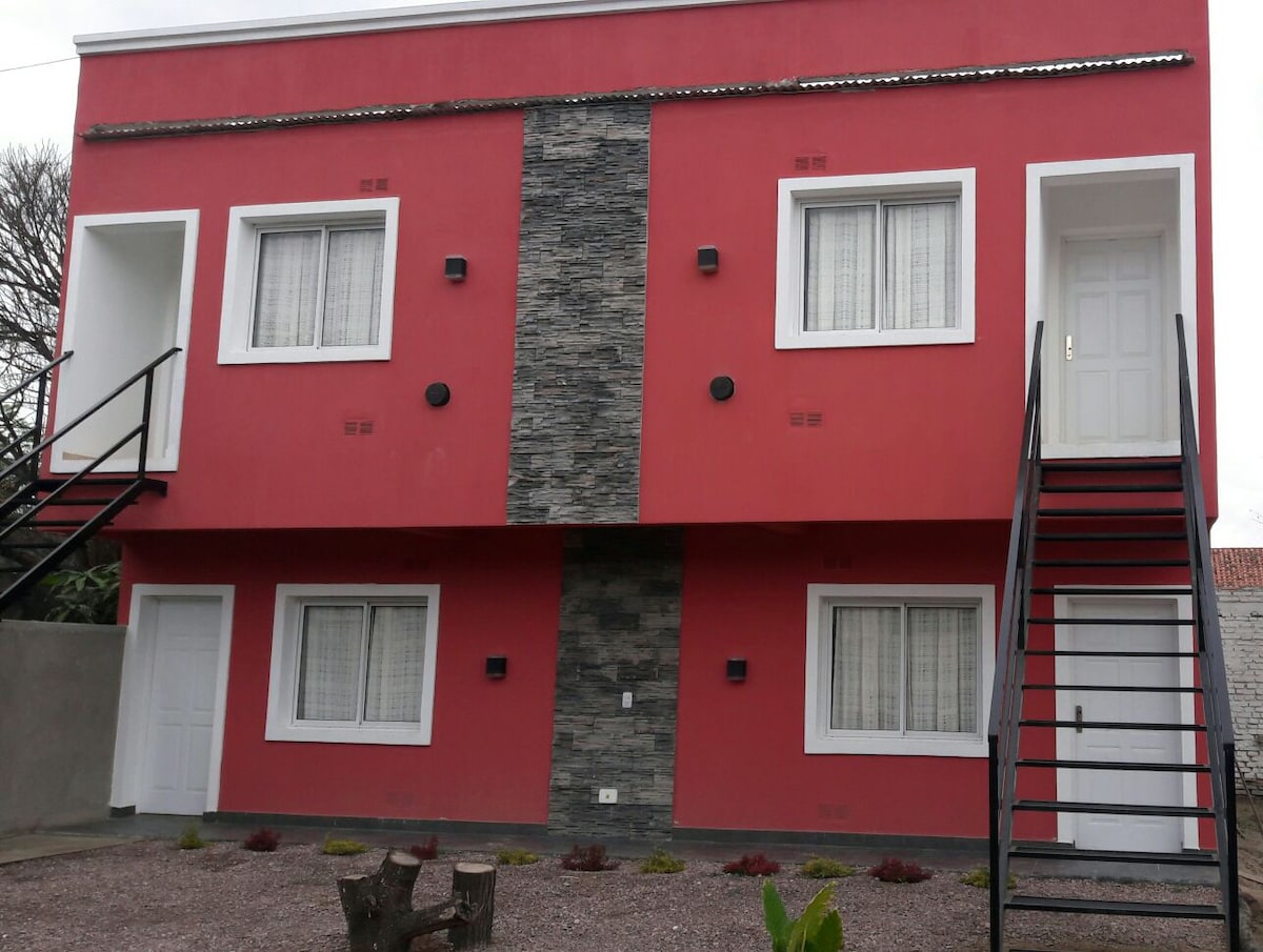 Es un departamento diseñado con buen gusto y funcionalidad, porque pensamos en nuestros huéspedes a la hora de hacerlos. Lugar tranquilo y cerrado, hecho para el disfrute y relajamiento. Tenemos pozo propio de AGUA TERMAL, por eso les brindamos este elemento en todas nuestras instalaciones. Estamos a 10 cuadras del centro en un barrio de casas bajas.