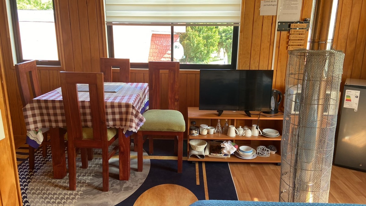 Acogedor Aparthote de un monoambiente, este pequeño espacio te entregará tranquilidad y comodidad para que disfrutes tu estadía. IMPORTANTE: Si deseeas cocinar, este no es tu lugar, NO CONTAMOS CON COCINA, en la descripción detallada encontrarás mayor info. Estamos ubicados en el corazón de la localidad de Puerto Río Tranquilo. Excelente lugar para descansar y relajarte mientras recorres esta bella Patagonia. Contamos con 2 departamentos más amplios y este más pequeño.