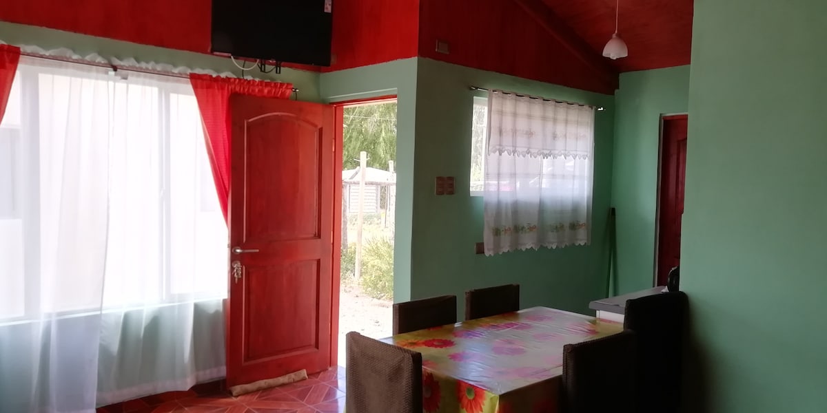 Hermosa cabaña para 4 personas, ideal para descansar en la Patagonia, disfrutar la naturaleza su flora y fauna con sectores que podrás recorrer y ver el Cerro Castillo. La localidad de Ibáñez cuenta con diferentes atractivos turísticos, como artesanías locales, Rutas de Escaladas, avistamientos de aves en el humedal urbano Chelenko visitar los saltos del Rìo Ibañez con impresionantes caídas de aguas. conocerás El Lago General Carrera el más grande Chile.
