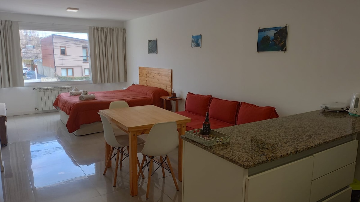 Acogedor Studio en la naturaleza Patagónica, a solo 200 metros de la Playa sin Viento, Lago Moreno. Entorno inmejorable y tranquilo, rodeado de bosque y cercano a Circuitos Turístico, para disfrutar de actividades como trekking, mountainbike, climbing, actividades náuticas. Cuenta con wifi, alarma, calefacción central por radiadores, directv pre pago, smartv, cocina full equipada. Estacionamiento dentro del establecimiento