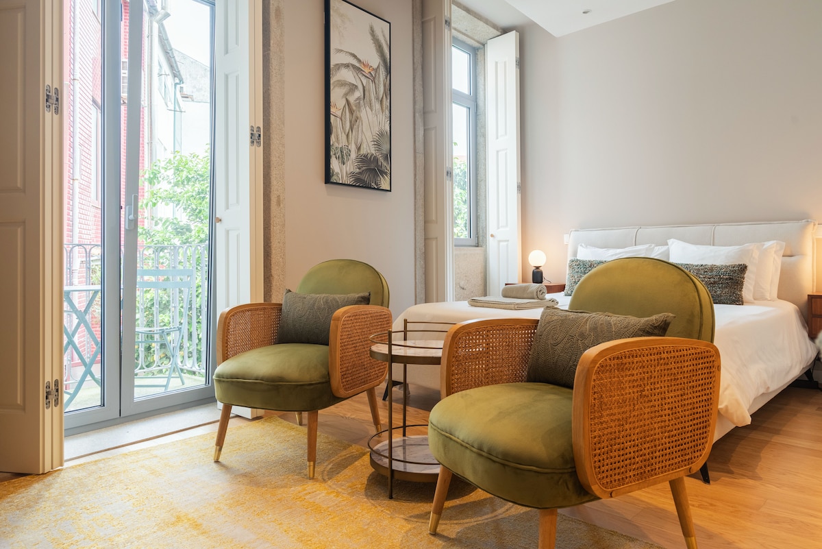 Stay in a stylish one-bedroom apartment in a historic Porto building, just steps from Clérigos Tower and Cordoaria and Virtudes Gardens. Enjoy a balcony with sweeping views over the Douro River - perfect for relaxing after a day of exploring. Like many heritage buildings, there’s no lift and a unique 0.5 bathroom design (private toilet + open sink & shower), adding to its charm. Surrounded by cafés, shops and landmarks it’s the perfect setting for friends and couples to fall in love with Porto.