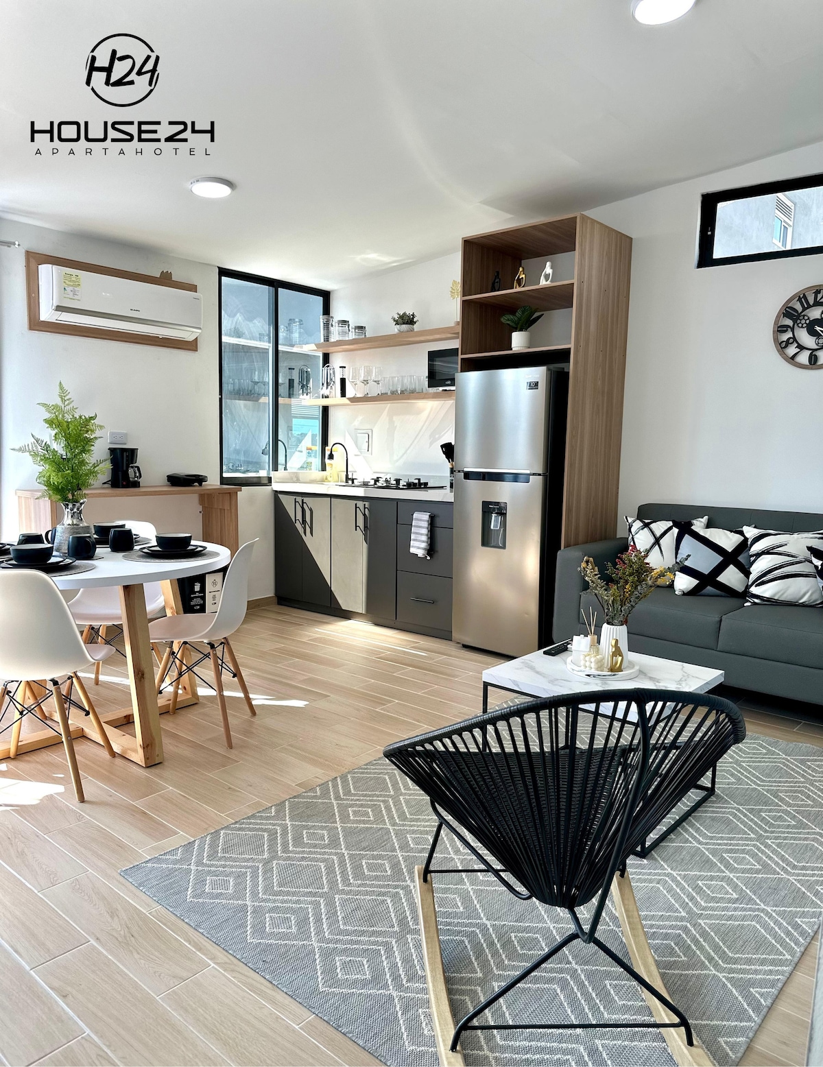 ¡Bienvenidos House24 en Yopal! Este espectacular apartamento de 2 habitaciones se encuentra en el piso 3 del apartahotel, fue diseñado y equipado para brindarte una estancia cómoda y agradable en tu visita a la ciudad, sea para viajes individuales o en grupo. Aquí encontraras habitaciones con TV de 40" y 50" Smartv, confortables camas, un baño amplio con zona de ropas equipada de plancha y lavadora secadora, una amplia sala de estar y cocina con todo lo que necesitas para preparar alimentos.