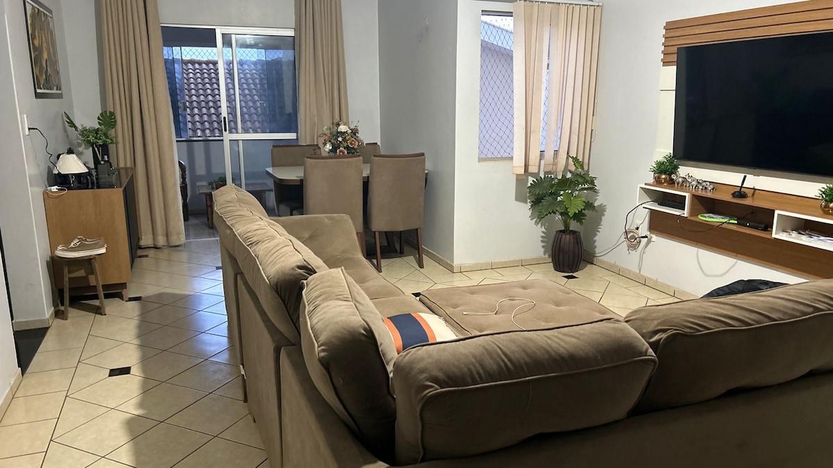 Apartamento de 3 quartos todos com ar split sala com ar cozinha com geladeira fogao de 6 bocas , microondas , purificador de agua , liquidificador , sanduicheira, chaleira etc. Quarto suite com cama queen e TV 42 , quarto casal cama padrão , Quarto solteiro com 2 camas e 1 cama extra e armario , sala com painel de TV ,46 polegadas tabua de passar , ferro, máquina de lavar, Banheiro c/ secador Localização privilegiada próximo ao shopping, supermercados, panificadoras, bares e restaurantes