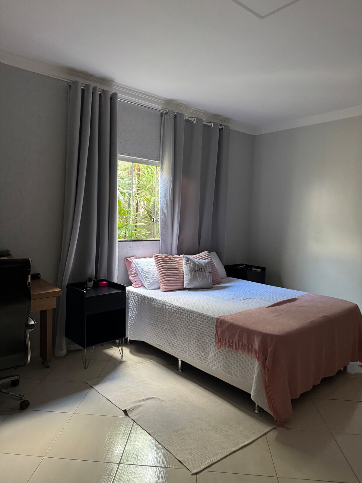 Casa espaçosa, contendo 3 quartos sendo 1 suite com ar condicionado, sala, cozinha, banheiro social, área de serviço, garagem para 3 carros cobertos, TV 55 com Netflix e Amazon, ducha para banho. Próximo ao buriti shopping, ao atacadao, e assai supermercados, próximo ao hospital Santa Terezinha (consultar para mais hóspedes)