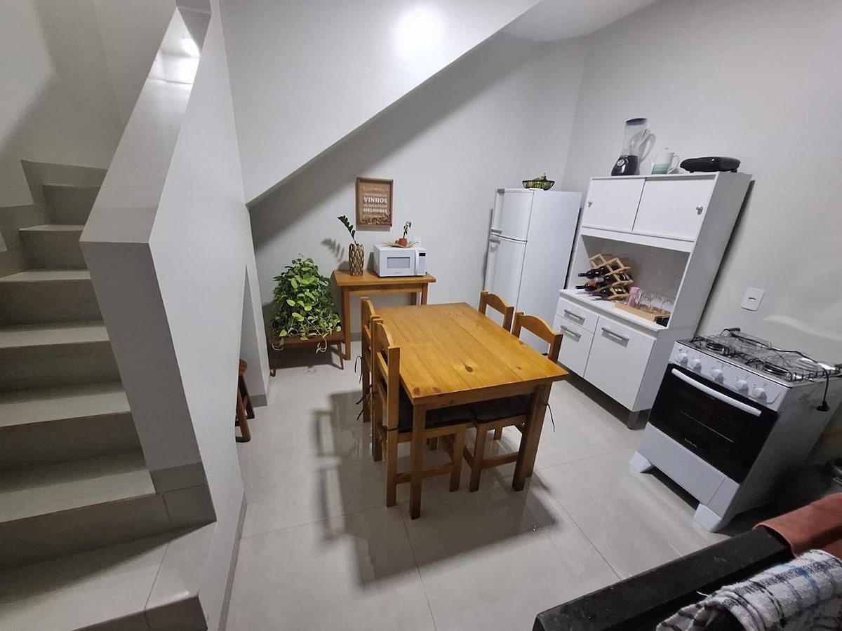 Apartamento duplex completo preparado para acomodar duas pessoas, podendo ser apenas uma cama de casal, ou duas camas de solteiro, conforme solicitação do cliente. Localizado entre a Universidade de Rio Verde (UNIRV) e o lago do bairro Interlagos.