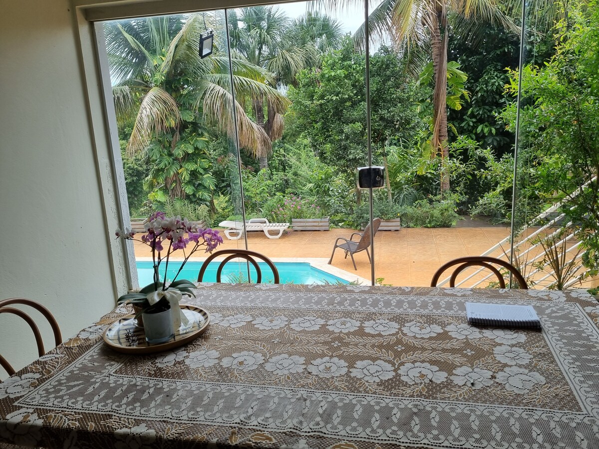 Este lugar especial fica perto de tudo e é ideal para planejar sua visita. Espaço amplo, cozinha completa, churrasqueira, área de lazer, piscina aquecida, mesa de pingue-pongue. Disponível para eventos: aniversário, confraternização.. São 4 quartos: Quarto 1 com ar condicionado uma cama casal e uma solteiro Quarto 2 com ar condicionado uma cama casal e uma solteiro Quarto 3 uma cama solteirão com climatizador Quarto 4 com ar condicionado uma cama solteirão + Sofá cama e colchão extra casal