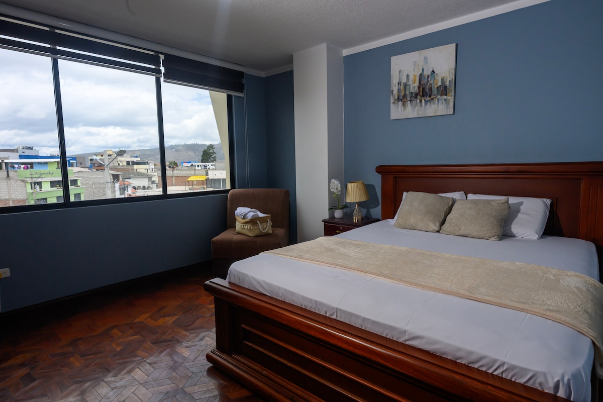 Disfruta de la sencillez de este alojamiento tranquilo y céntrico, con la comodidad de recibir atención y recomendaciones directamente del anfitrión ya que vivo en el mismo edificio, vista los nevados mas hermosos y visitados del ecuador Chimborazo, Tungurahua, El Altar, Carahuairazo. con 3 habitaciones totalmente amobladas para el confort de su estadia, con tv en cada habitación ( Netflix, Directv), Armarios, adicional cuenta con su area de lavanderia, parking y terraza!