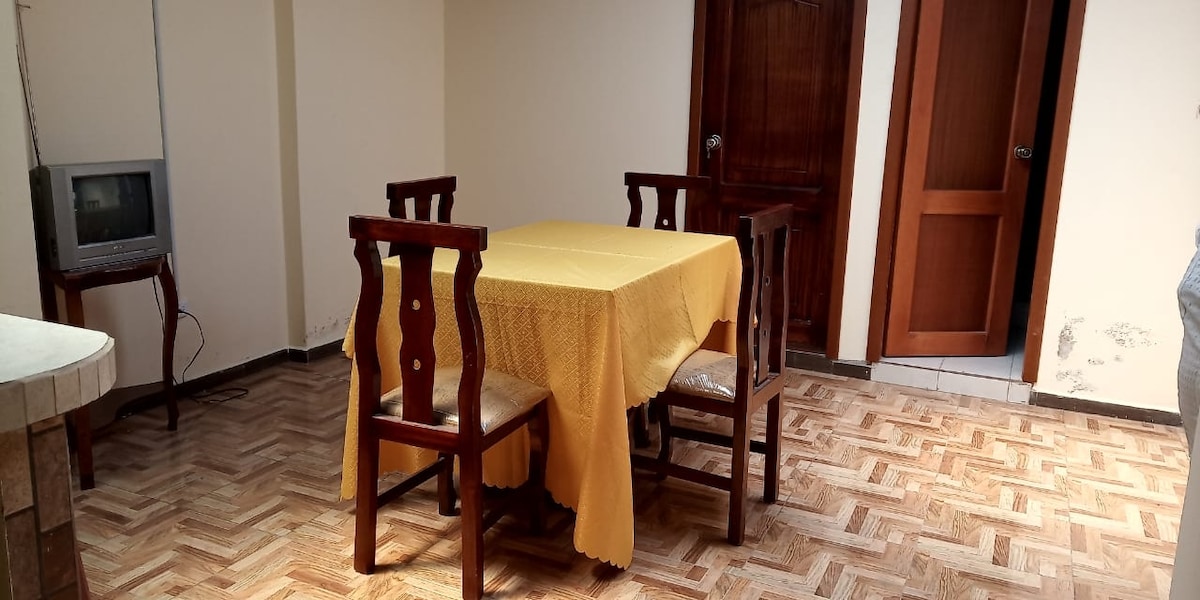 Departamento cómodo y seguro, su ubicación está en una de las mejores zonas de Riobamba, en el sector Paseo Shopping ,UNACH es un gusto para mí poderte recibir personalmente, mis huéspedes han estado muy contentos con el servicio que brindo. El DEPARTAMENTO SE ENCUENTRA EN EL TERCER PISO ( no contamos con ascensor) además puedes disfrutar de una hermosa vista desde las habitaciones, dispones de un amplio espacio para compartir con tu familia, cuenta con garaje y lavandería.