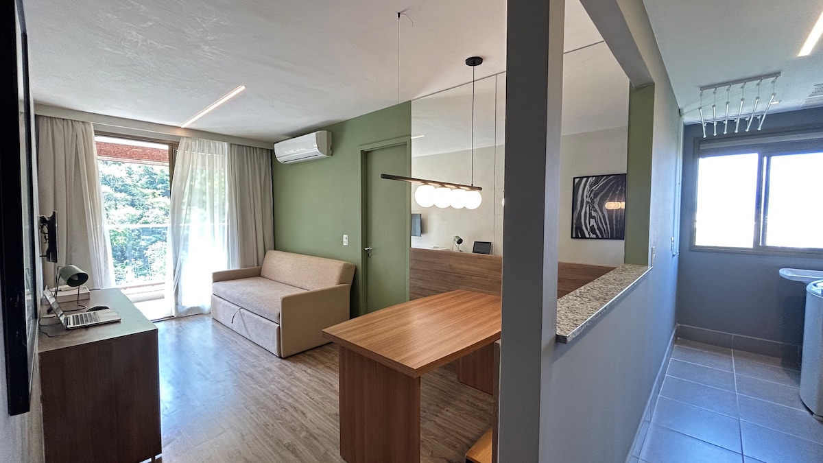 Apartamento estilo flat super aconchegante e lindo , com decoração moderna e clean perfeito para quem deseja desfrutar do seu momento de trabalho ou lazer com conforto, segurança, limpeza e boa localização . O sol é da manhã, vista livre para verde, andar alto, ambiente refrigerado. O apartamento tipo flat, encontra-se dentro de condomínio fechado com segurança, área de lazer com piscina, sala fitness, sauna e loja de conveniência para compras rápidas. Espaço acomoda bem duas pessoas