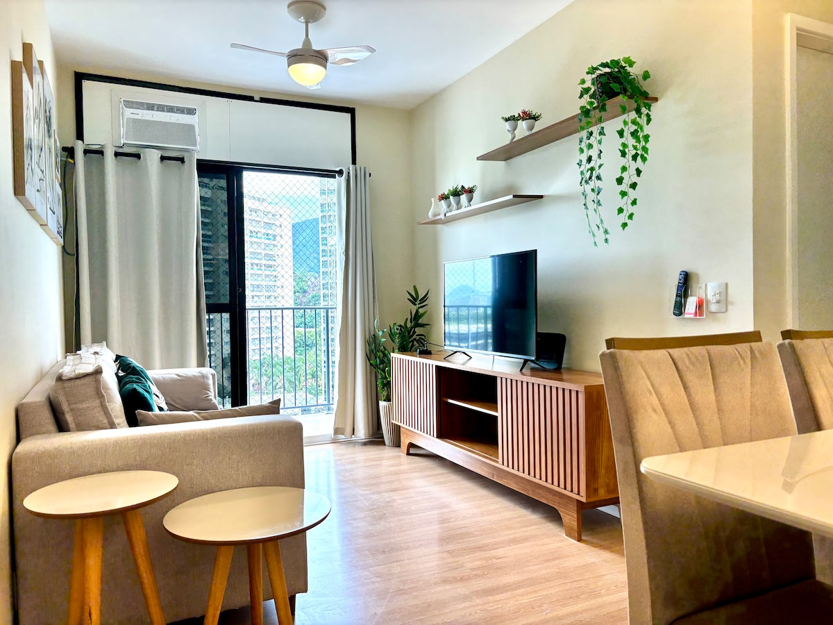 Flat moderno e aconchegante, reunindo o conforto de um hotel com a liberdade de um lar. Ideal tanto para quem viaja a lazer quanto a trabalho, o espaço conta com uma suíte com cama queen, ar-condicionado, Wi-Fi, TV e frigobar. O condomínio oferece uma excelente infraestrutura: academia, piscina, sauna, jacuzzi e restaurante com preços acessíveis. A localização é privilegiada, a apenas 100 metros do RioCentro, garantindo praticidade e fácil acesso a diversas atrações na Barra da Tijuca.