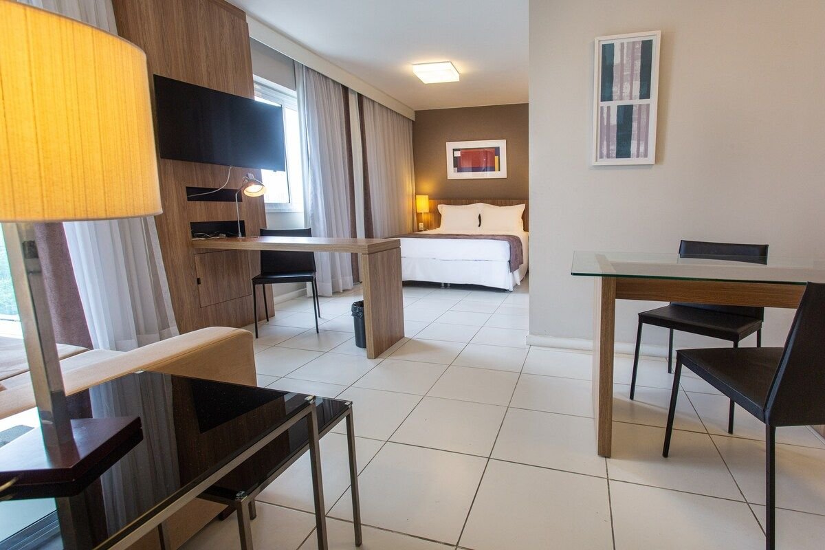 Flat moderno e aconchegante, reunindo o conforto de um hotel com a liberdade de um lar. Ideal tanto para quem viaja a lazer quanto a trabalho, o espaço conta com uma suíte com cama queen, ar-condicionado, Wi-Fi, TV e frigobar. O condomínio oferece uma excelente infraestrutura: academia, piscina, sauna, jacuzzi e restaurante com preços acessíveis. A localização é privilegiada, a apenas 100 metros do RioCentro, garantindo praticidade e fácil acesso a diversas atrações na Barra da Tijuca.