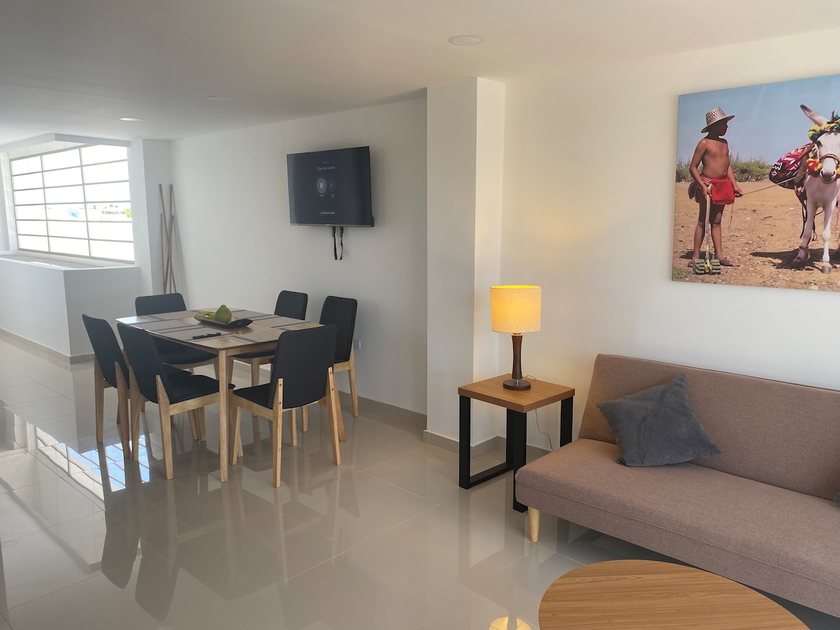 Hermoso apartamento acogedor con alma guajira, ideal para familias o grupos que buscan conexión, descanso, cultura y momentos inolvidables. A solo 2 cuadras del mar, cuenta con 2 habitaciones, WiFi de 500Mb, Aires acondicionados, cocina equipada y Smart TV. Disfruta sus hamacas tradicionales y el encantador balcón con vista al centro, perfecto para compartir momentos especiales. Cada rincón está decorado con artesanías Wayuu que te conectan con la esencia de La Guajira.