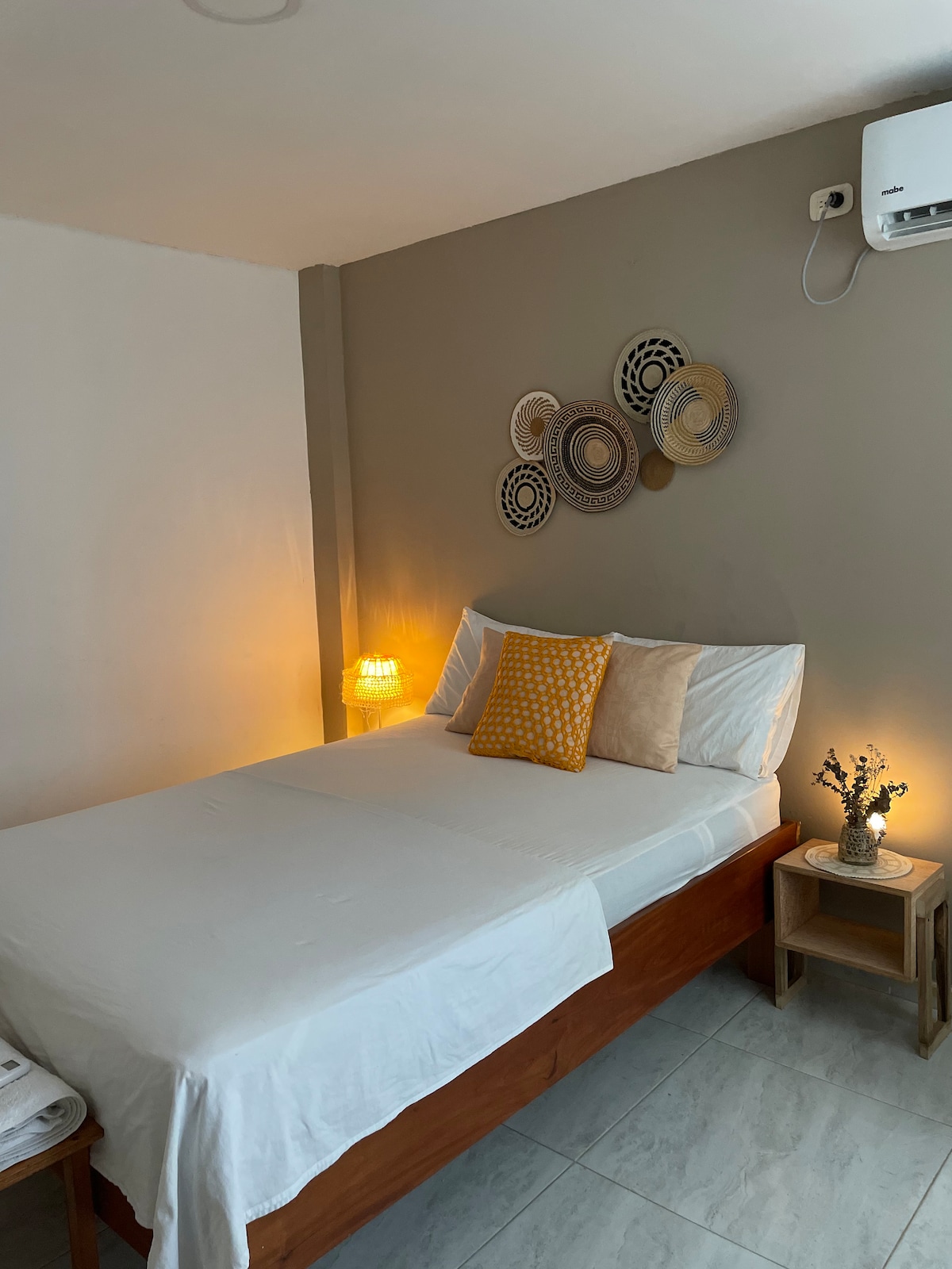 Disfruta una habitación fresca con cama doble, baño privado, aire acondicionado y Wi-Fi, a solo 4 cuadras de la playa. Podemos adecuarla con una cama adicional para alojar hasta 3 personas (costo extra). Antes de reservar: – Aún no contamos con TV. – La zona es activa y algunos fines de semana puede haber ruido por comercios cercanos, algo típico de la costa.