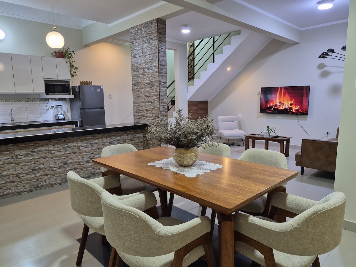 Disfruta de esta hermosa y acogedora casa en Moyobamba, ideal para familias o grupos de amigos. Cuenta con 2 dormitorios con camas queen, 2 baños completos y una amplia sala-comedor con TV. La mampara conecta con la piscina, mini terraza y jacuzzi. Cocina totalmente equipada y lavandería. Además, incluye juegos de mesa para compartir y disfrutar momentos únicos en un ambiente cómodo, relajante y pensado para tu descanso.