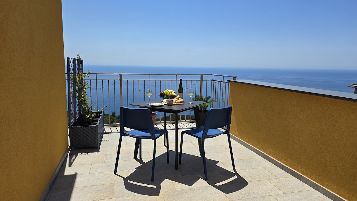 Enjoy a unique luxury experience, starting with the imposing bougainvillea on the facade of the Villa Ferrer housing the apartment. In front, just a few meters away, the beach and the deep blue sea of Cinque Terre. Amazing sea view also inside the apartment, where you'll find authentic Genoese floor tiles and a collection of contemporary art and design: like an iconic Fornasetti table, vintage Kartell chairs, a limited Rosenthal 70's edition, and works of Sabattini and Kuroda.