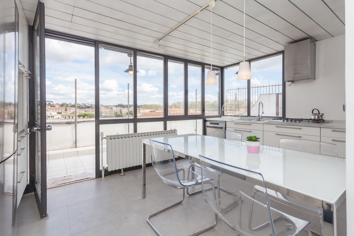 - Panoramic loft in one of Rome's best streets just a few steps from Piazza di Spagna. - Just steps away from the main sightseeing hotspots. - Extremely well positioned and connected to all major transport systems. -Gym a few steps away. - Electric window shades. - Very quiet. - Design furniture and accessories. - Very safe. - Large windows. - Sunny terrace with large sofas and dining table. - Chair lift for luggage. - Possibility of hiring a private driver to and from the airport.