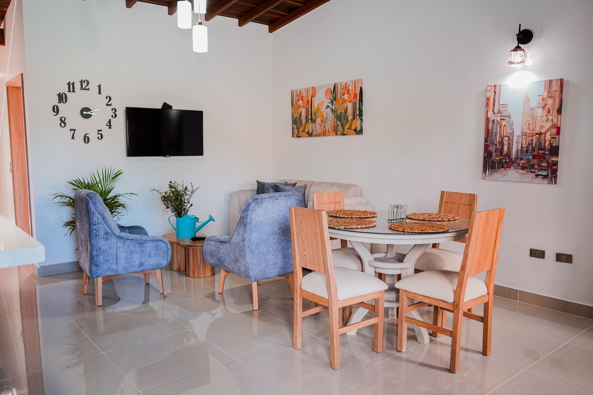 Porta Nova Suites - Just 5 minutes away from MDE Rionegro Airport. Our cozy 1-bedroom 2-bathroom apartment offers a king-sized bed, sofa bed, balcony with nature views, and easy access to Hospital San Vicente. Enjoy our building's amenities: Pool, Spa, Gym, Coworking Space, and TV room. With private garage parking and daily cleaning available, your comfort is our priority. Experience the perfect blend of convenience and relaxation in "your home away from home." Book your stay today!