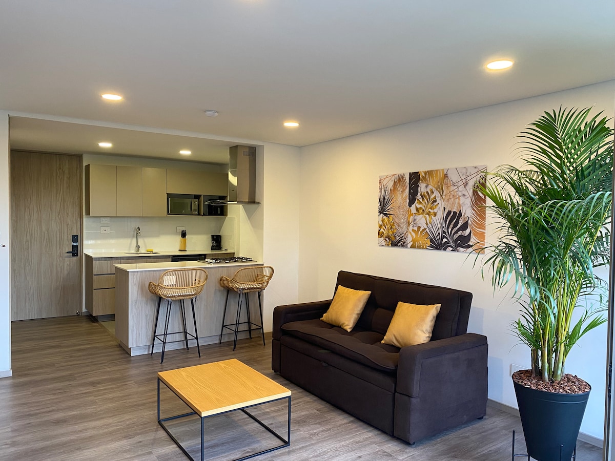 ✨ Lujo y Ubicación: Apartamento moderno de 2 habitaciones a solo 3 min del Aeropuerto JMC ✈️. Capacidad hasta 6 huéspedes (3 camas), con parqueadero gratis 🅿️, WiFi alta velocidad 📶 e ingreso autónomo. Disfruta de cocina totalmente equipada, Smart TV, decoración elegante y ventanales amplios en zona segura y conveniente. ¡Reserva ahora y vive el confort y la comodidad!