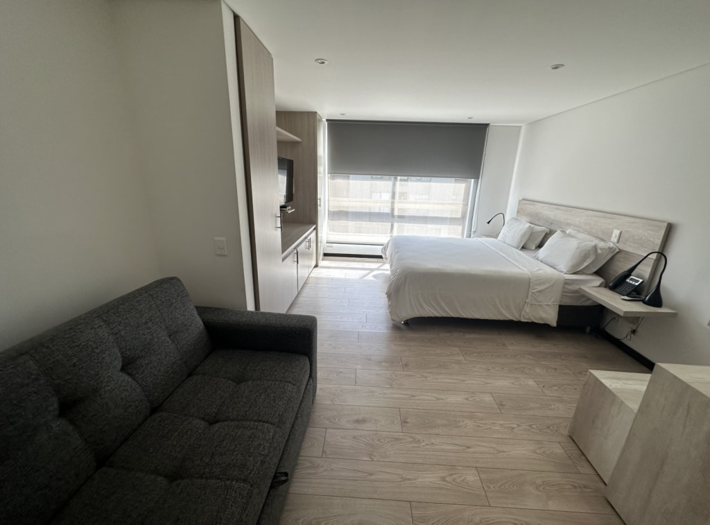 Con un amplio espacio de 23m2, cuenta con una acogedora alcoba, una zona de entretenimento perfecta para relajarte, un balcón para disfrutar de una espléndida vista, cocina equipada, un cómodo escritorio para trabajar; amplio vestier para organizar tus pertenencias, lencería de calidad y un baño completo para tu comodidad. Cuenta con cajilla de seguridad, plancha y mesa para planchado.