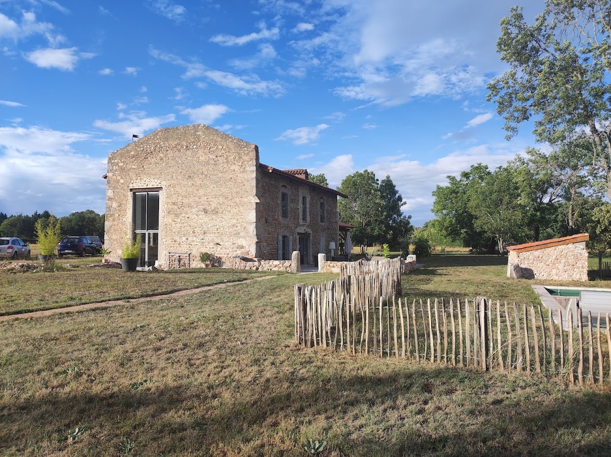 Corps de ferme rénové, dans un lieu paisible pour vous offrir un séjour de détente en famille ou entre amis. Vue panoramique imprenable, aucun vis à vis, possibilité de se reconnecter à la nature. Piscine, billard, jeu de fléchettes, ping-pong, jeux de société à dispo, balançoire, potager, 3 VTT. Chemins de rando, forêt à 50 m de la maison. Etang de pêche à 10 mn. 25 mn de Roanne, 45 mn de Lyon, 20 mn du Lac des sapins (Cublize) avec accrobranche, balades à poney... Karting à 20 mn (Bully).